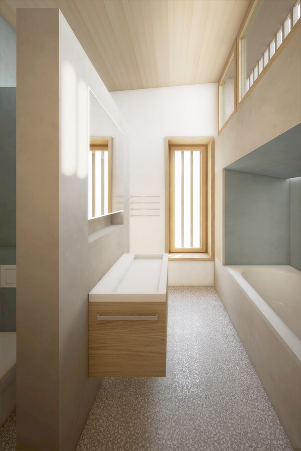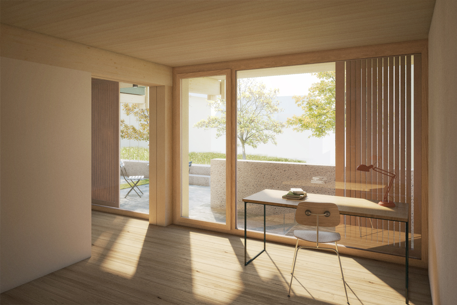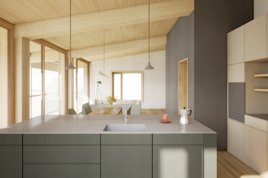 raumfindung architekten erzielen beim eingeladenen „Pitch" für eine Wohnüberbauung in Zumikon den 1. Rang. Die Konzeption verpflichtet sich dem nachhaltigen Bauen und geringem CO2-Verbrauch. Die Wohnhäuser sind aus Holzelementbauweise konstruiert und in den prägenden Lehmkernen sind die Wohnküchen und Bäder integriert.