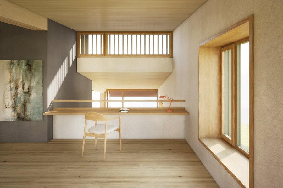 Das Einfamilienhaus vereint die Vorzüge von einem Holzbau, kombiniert mit einem massiven, mittigen Gebäudekern als zentraler Dreh- und Angelpunkt. Um den Gebäudekern formiert sich über drei Geschosse eine räumlich vielfältige Wohnlandschaft, Sichtbezüge im Innenraum über die zweigeschossigen Räume und die atmosphärischen Ausblicke lassen einen grosszügigen Raumeindruck entstehen. Die rohen Holzoberflächen sorgen für Behaglichkeit und der Einsatz von Lehmputz unterstützt das angenehme Raumklima.