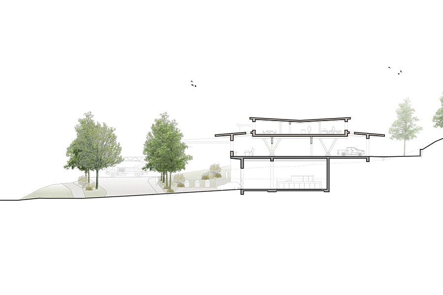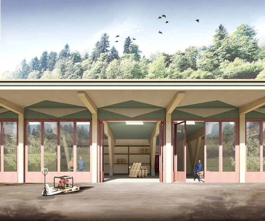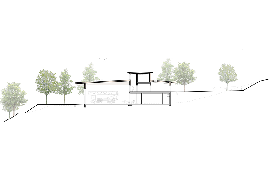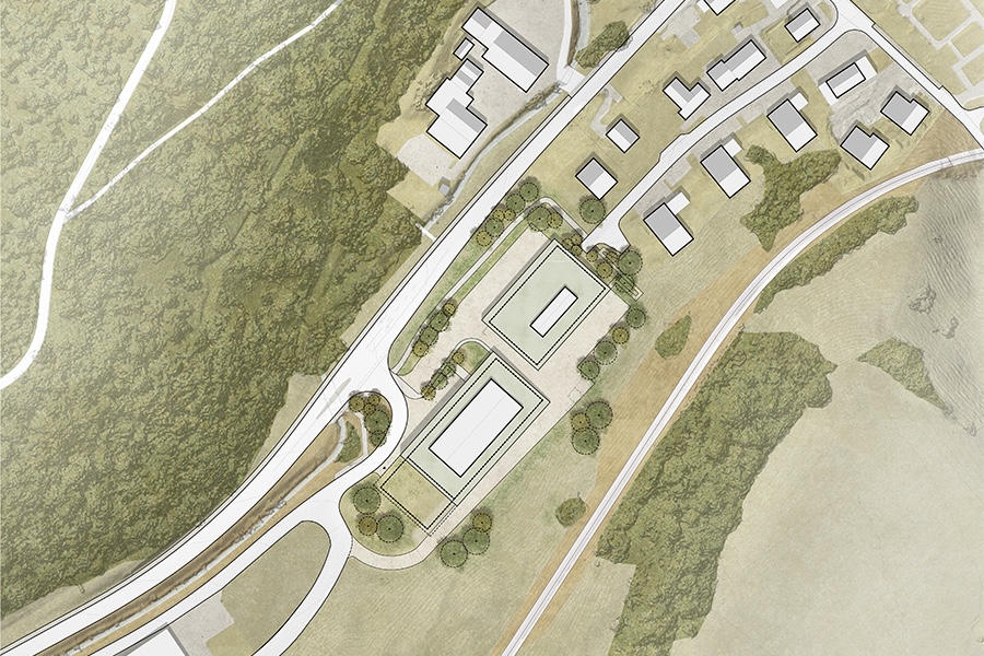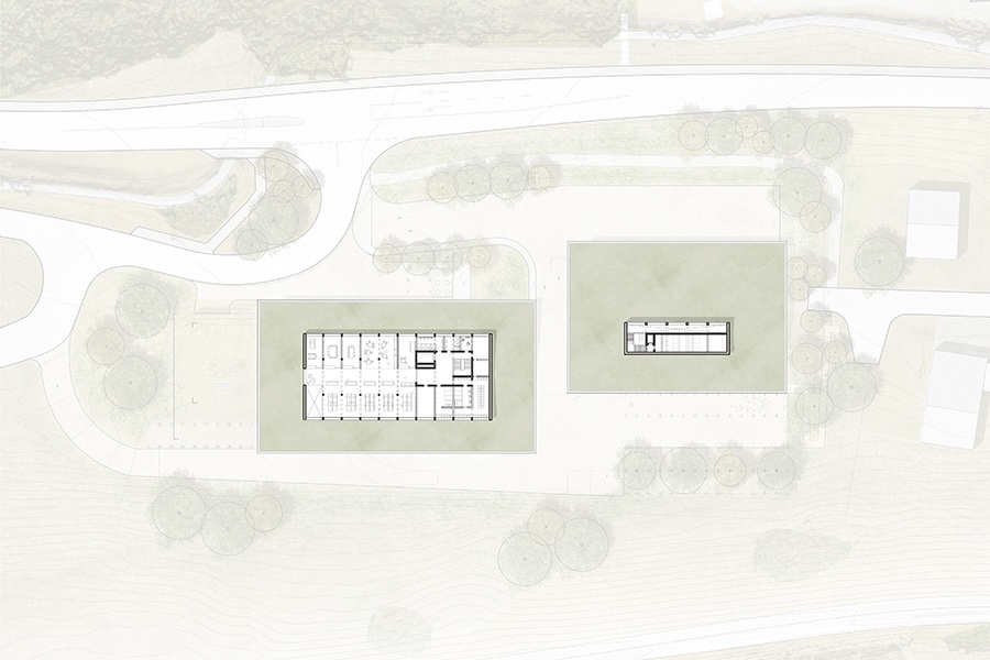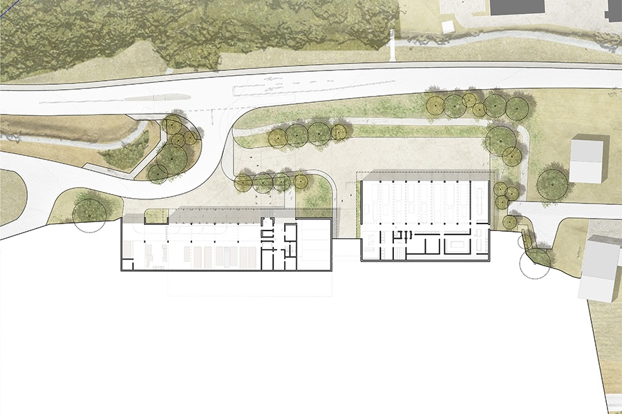 Der neue Werkhof Langmatt vereint die Feuerwehr, Werkhof und Wertstoffsammelstelle auf dem Areal Langmatt. Der Entwurf „Feuer und Flamme“ ist auf die Nutzeranforderungen, den vorgefundenen Besonderheiten des Ortes und das ISOS massgeschneidert. Dabei werden die Nutzflächen konsequent auf zwei Gebäude aufgeteilt: die Feuerwehr und den Werkhof. Dank der Hanglage profitieren die Nutzungen jeweils von zwei Erdgeschossen pro Gebäude. Auf Grund der gewachsenen Topografie werden die beiden Einstellhallen für die Feuerwehr und die Wertstoffsammelstelle talseits ebenerdig bedient. Auf ein zusätzliches Untergeschoss oder eine Tiefgarage wird verzichtet. Die Fahrzeughallen des Werkdienstes und der PW-Parkplatz für die Feuerwehr werden hingegen hangseitig ein Geschoss höher angeordnet. Die Feuerwehr verfügt als Blaulichtorganisation bei einem Einsatz über eine direkte Ausfahrt und der