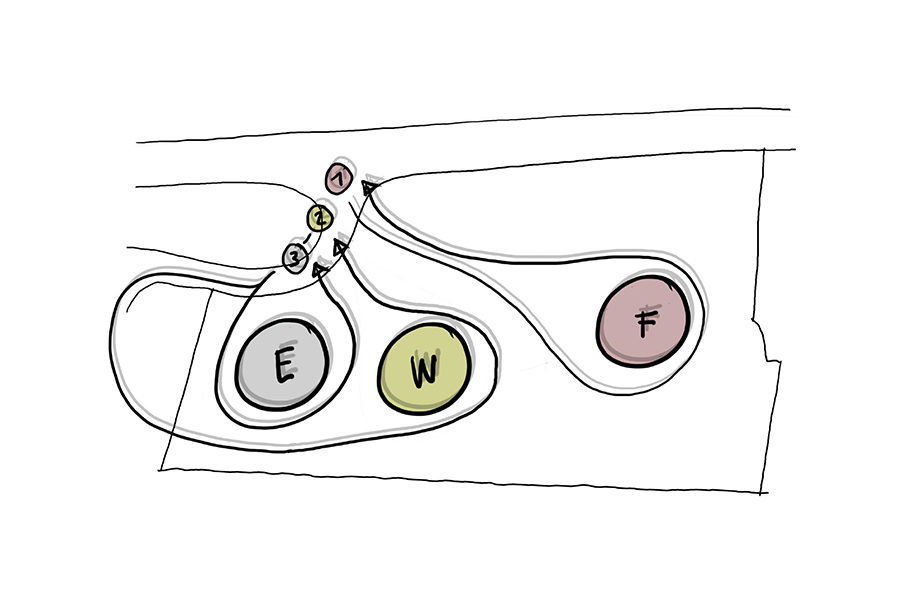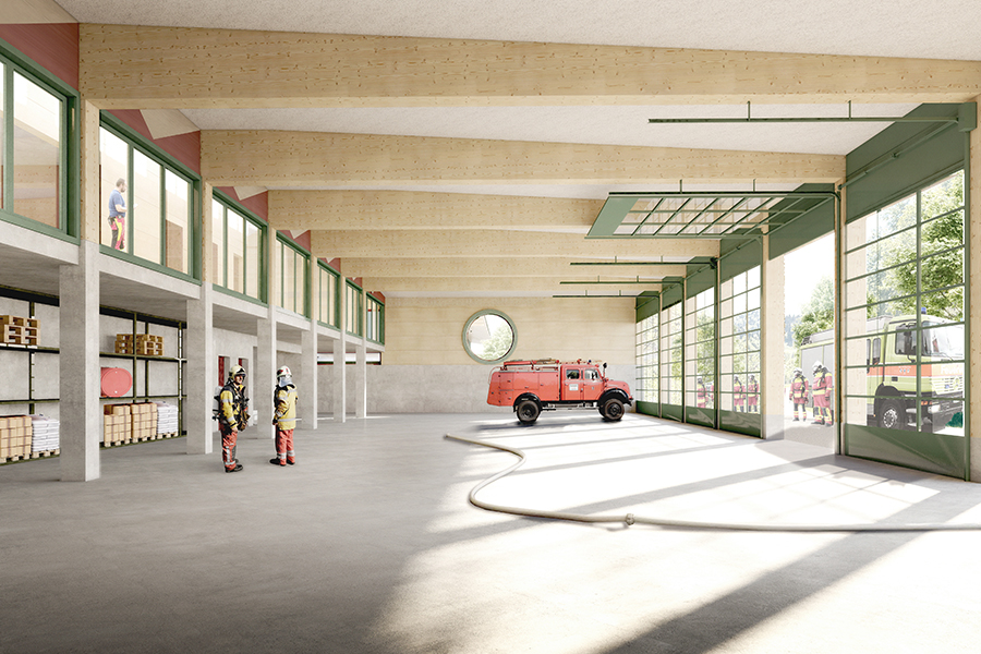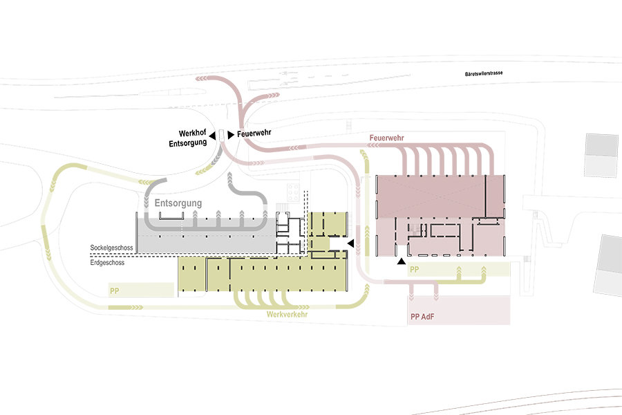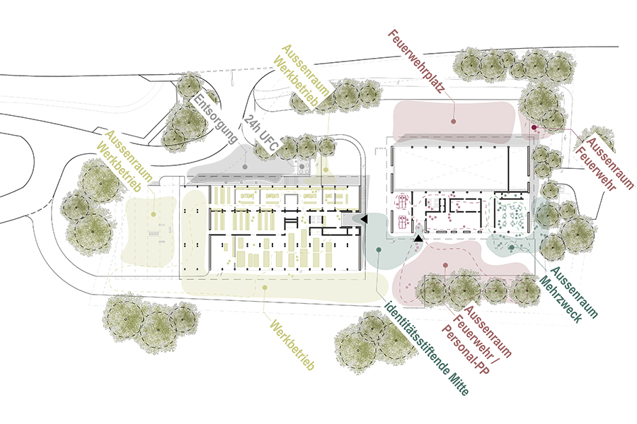 Publikumsverkehr zur Entsorgungsstelle wird möglichst früh, ohne Störung des Berufsverkehrs, zu Beginn des Areals auf Strassenniveau abgewickelt. Dank der Anordnung der beiden Gebäude resultieren vier Freiräume, welche jeweils übersichtlich einer Nutzergruppe zugeordnet werden können. Damit resultiert eine funktionale Gesamtanlage und der Betrieb der einzelnen Nutzer kann unabhängig erfolgen. Der Theorieraum wird als Versammlungsort zusätzlich über das Fusswegnetz mit seitlichem Zugang von der Quartierstrasse über einen behindertengerechten Fussweg mit 6% Gefälle erreicht. Die Nutzflächen innerhalb der Gebäude sind frei zonierbar und die raumtrennenden Innenwände werden nichttragend ausgebildet. Das Gebäudepaar „Feuer und Flamme“ zeigen sich als feingliedrige Holzbauten, die Holztragwerke und die kompakten Gebäudehüllen erfüllen die Vorgaben für nachhaltiges Bauen (Klimapfad).