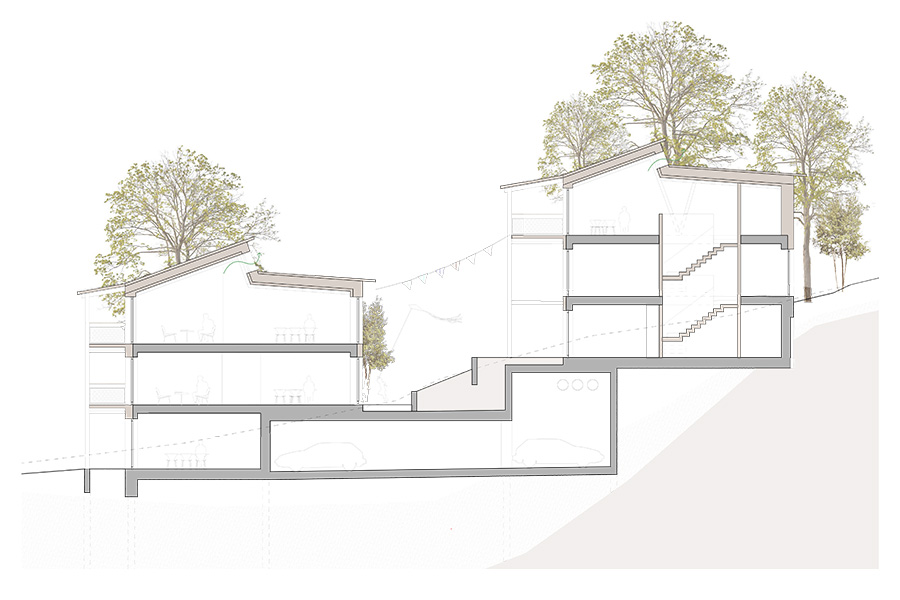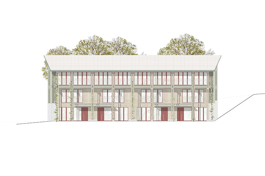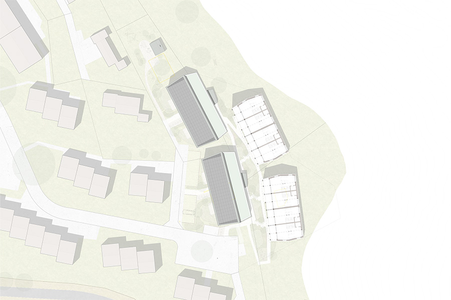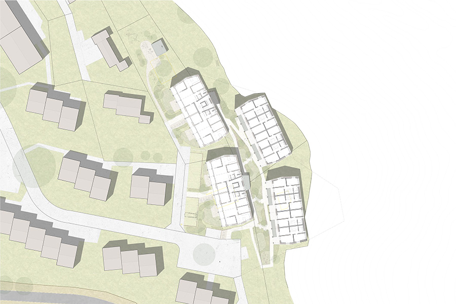raumfindung architekten erzielen beim eingeladenen „Pitch" für eine Wohnüberbauung in Zumikon den 1. Rang. Die Konzeption verpflichtet sich dem nachhaltigen Bauen und geringem CO2-Verbrauch. Die Wohnhäuser sind aus Holzelementbauweise konstruiert und in den prägenden Lehmkernen sind die Wohnküchen und Bäder integriert.