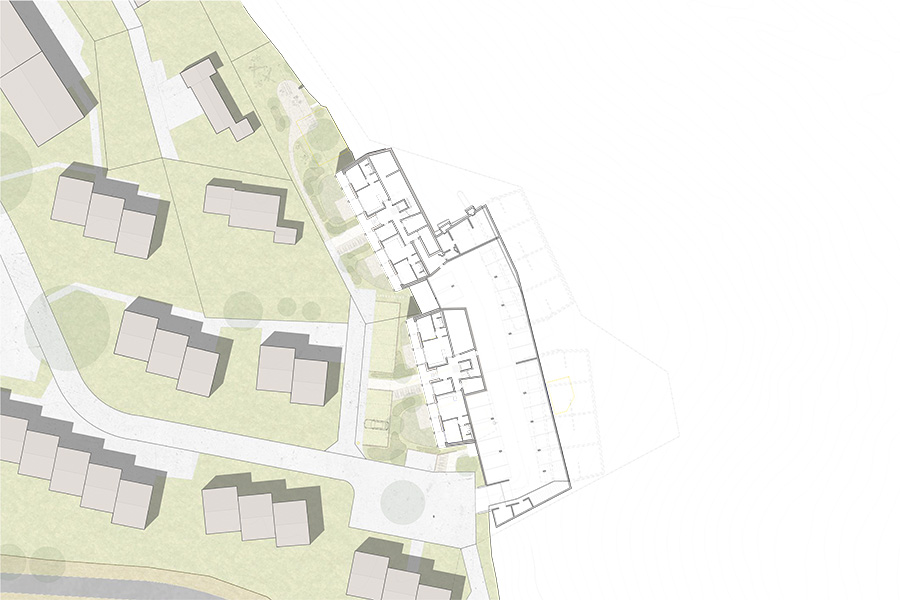 "Geschickt werden drei gegliederte, viergeschossige Gebäudevolumen präzis und selbstverständlich dem Strassenverlauf folgend auf die Grundstücke südlich und nördlich der Strasse gesetzt." (Aus dem Jurybericht)
